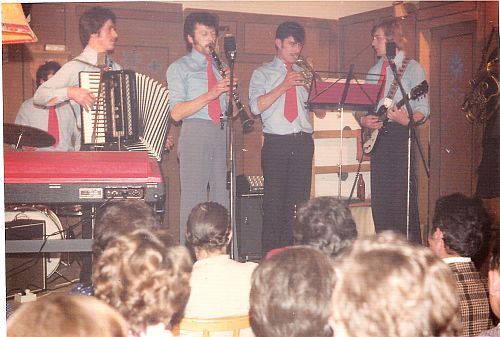 Foto aus dem Jahr 1977 mit Eller Hans, Oswald Mader, Ernst Jenewein, Siegfried Eller und Josef Jenewein